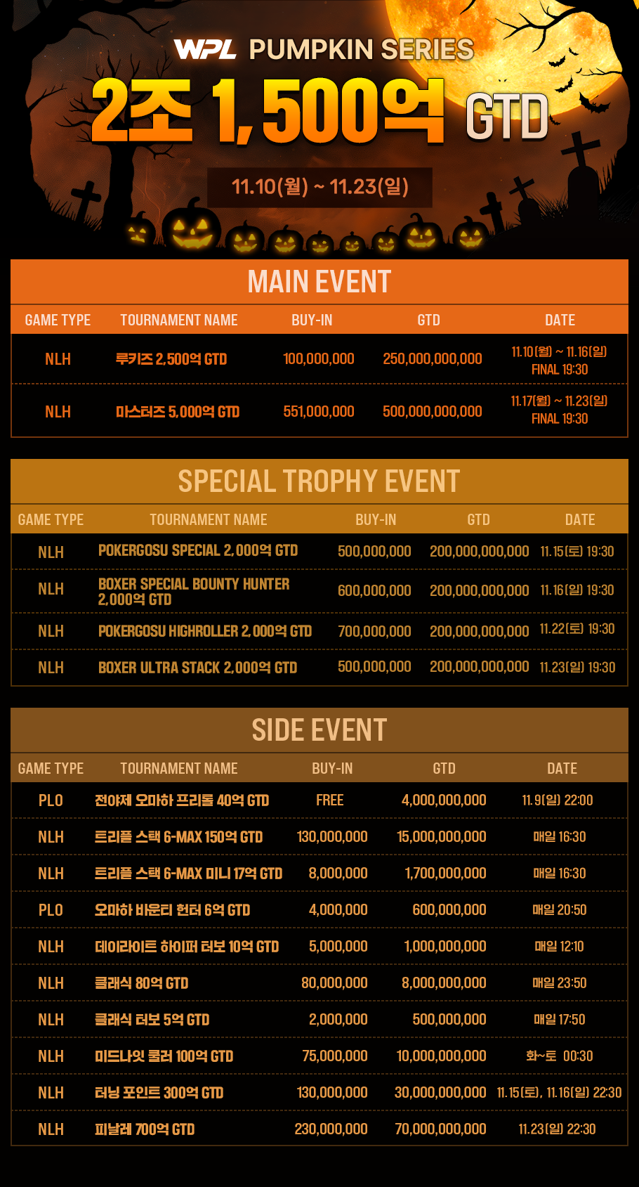 안녕하세요. 대한민국 포커의 새로운 기준 WPL입니다. 대한민국 1등 홀덤 WPL의 2025 펌킨 시리즈가 시작됩니다! 가을 호박처럼 충실하게 꽉꽉 채운 2조 1,500억 GTD 규모의 토너먼트 스케줄!! 세부 내용은 하단 포스터를 참고 부탁드립니다.![]()