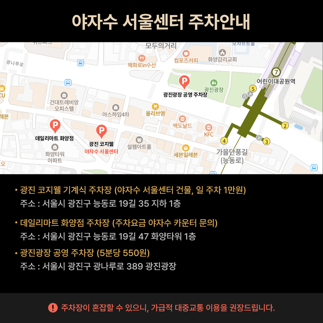 - 광진광장 공영주차장 (광나루로 389, 5분당 550원)